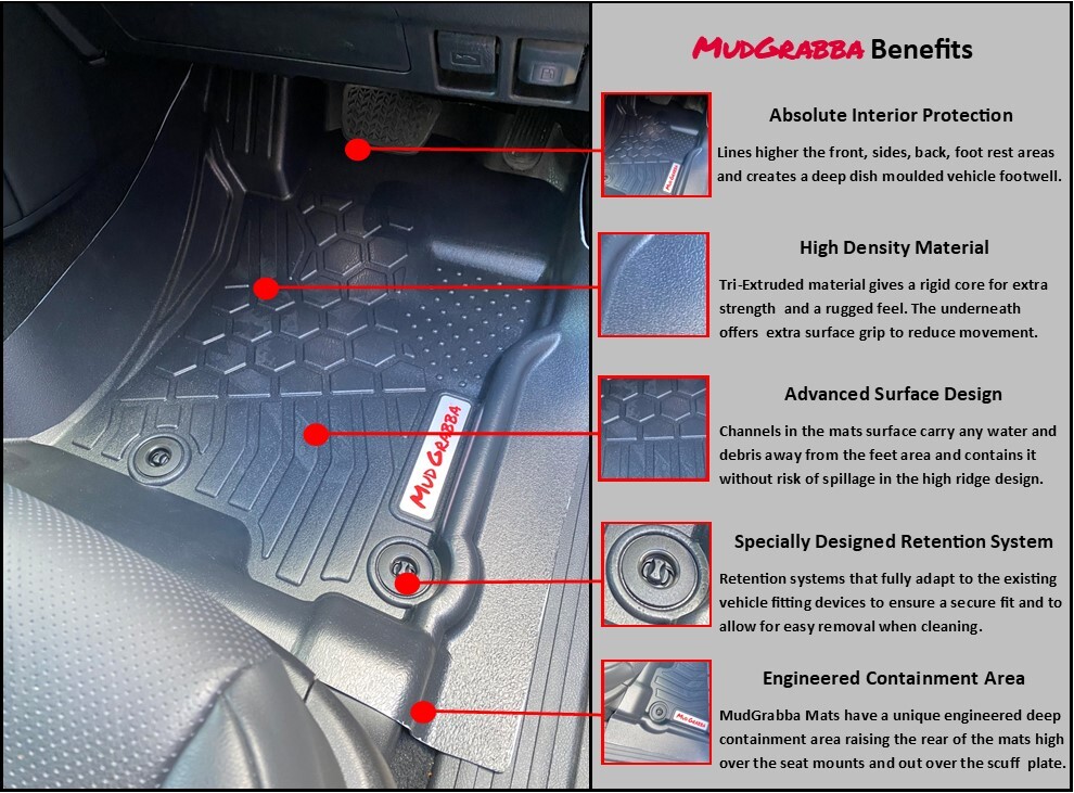 The MUDGRABBA Mat has been deleloped on the back of some twenty years experience in manufacturing 4WD floor mats in Australia including the Sandgrabba Mats and unlike the competitors each mat fully covers the foot wells of the 4wd, going up the firewall and back to the seat brackets also covering the sill over the scuff plates ensuring what most mats can't do, MUDGRAABA keeps everything outside where it belongs.